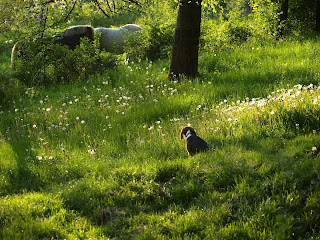 Trawa u nas jeszcze niekoszona, kwitną różności, a kiedy psy przebiegają, to Amika jeszcze widać, ale Mimi ... tylko biała końcówka ogona śmiga wśród traw ... jak w bajce o zakochanym skunksie:-)
